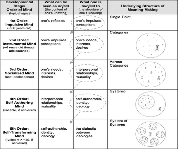 Psychologist and retired Harvard professor, Robert Kegan, contributed to the opus of adult development in 1994 with a theory called 'Orders of the Mind'. He paints a ladder showing the different magnitudes of awareness in one's perspective.